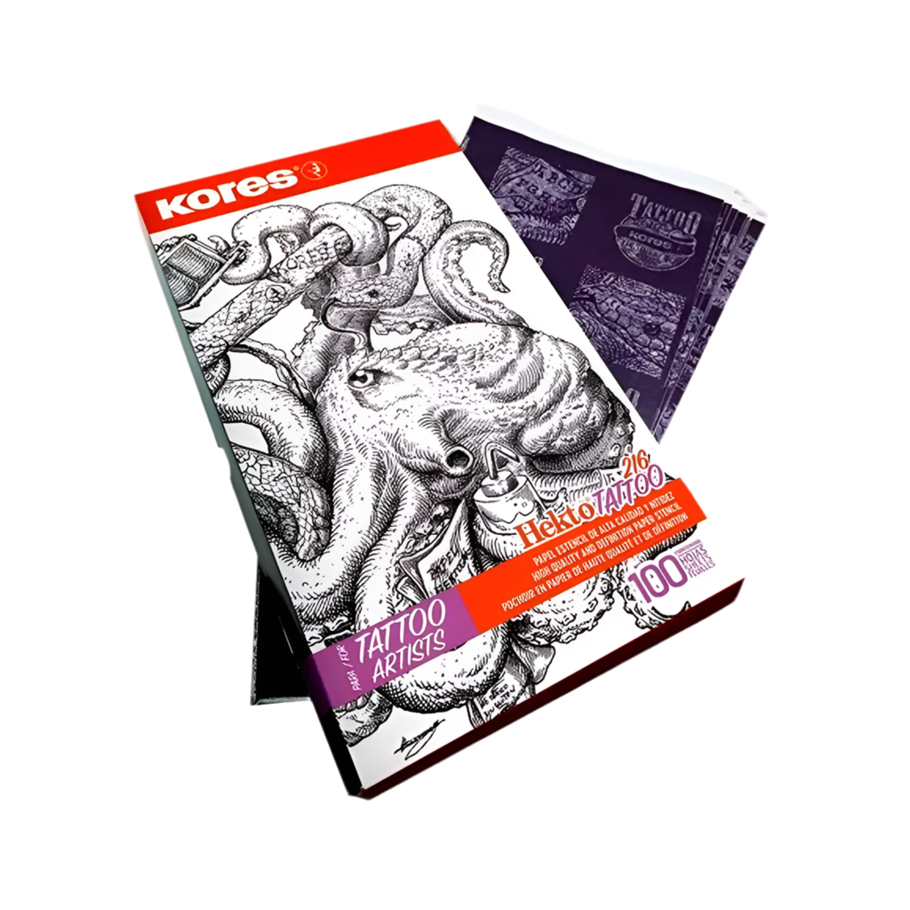 Papel de transferencia de alta calidad, ideal para calcar diseños con precisión en la piel. El Kores Hectográfico asegura trazos claros y duraderos, facilitando el trabajo del tatuador. Su fórmula de tinta es segura para la piel, proporcionando una excelente adherencia y definición en el trazo, lo que garantiza una transferencia precisa y fiable durante todo el procedimiento.